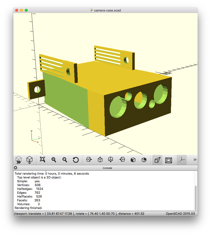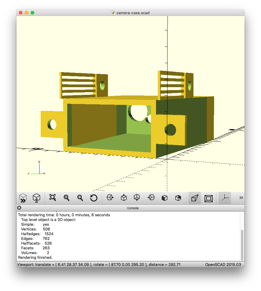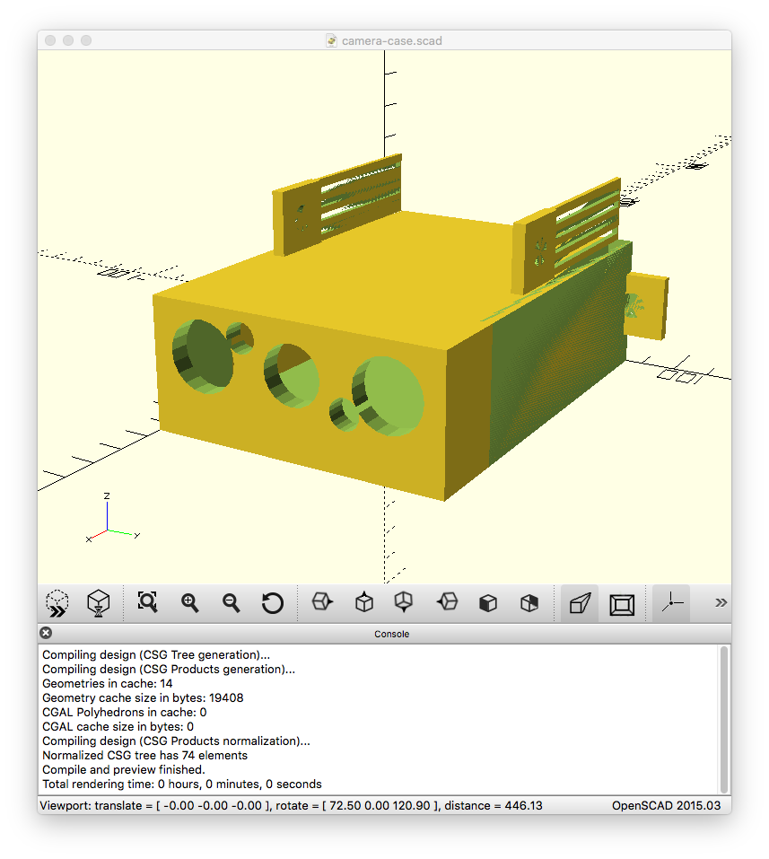 The modeling is the part that I knew I would enjoy the most; it also was the bulk of the work. I used the free and open-source OpenSCAD software for the 3D-modeling, which is listed as "The Programmers Solid 3D CAD Modeller". Checkout the rendering of my camera-case design in OpenSCAD,